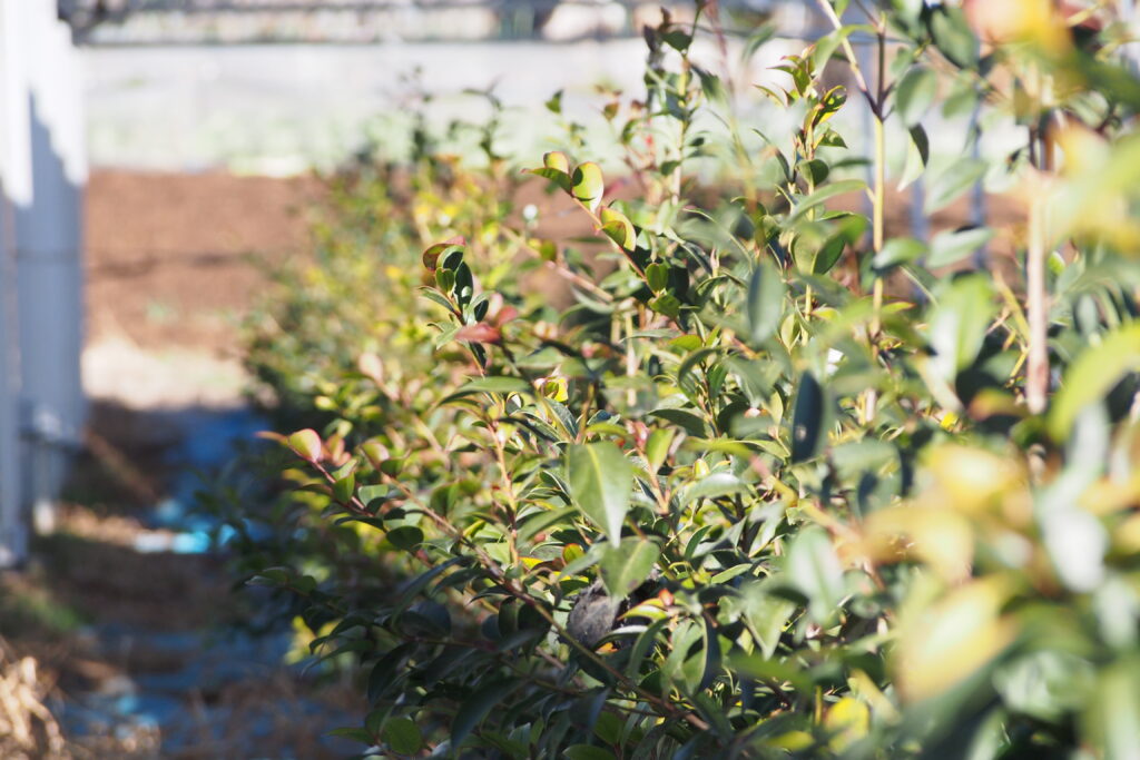 弊社本社のパイロットファームとして、太陽光パネルの下で榊の植え付け・栽培管理をさせていたただいております。4-5年後からは優良な榊の収穫拠点となる予定です。